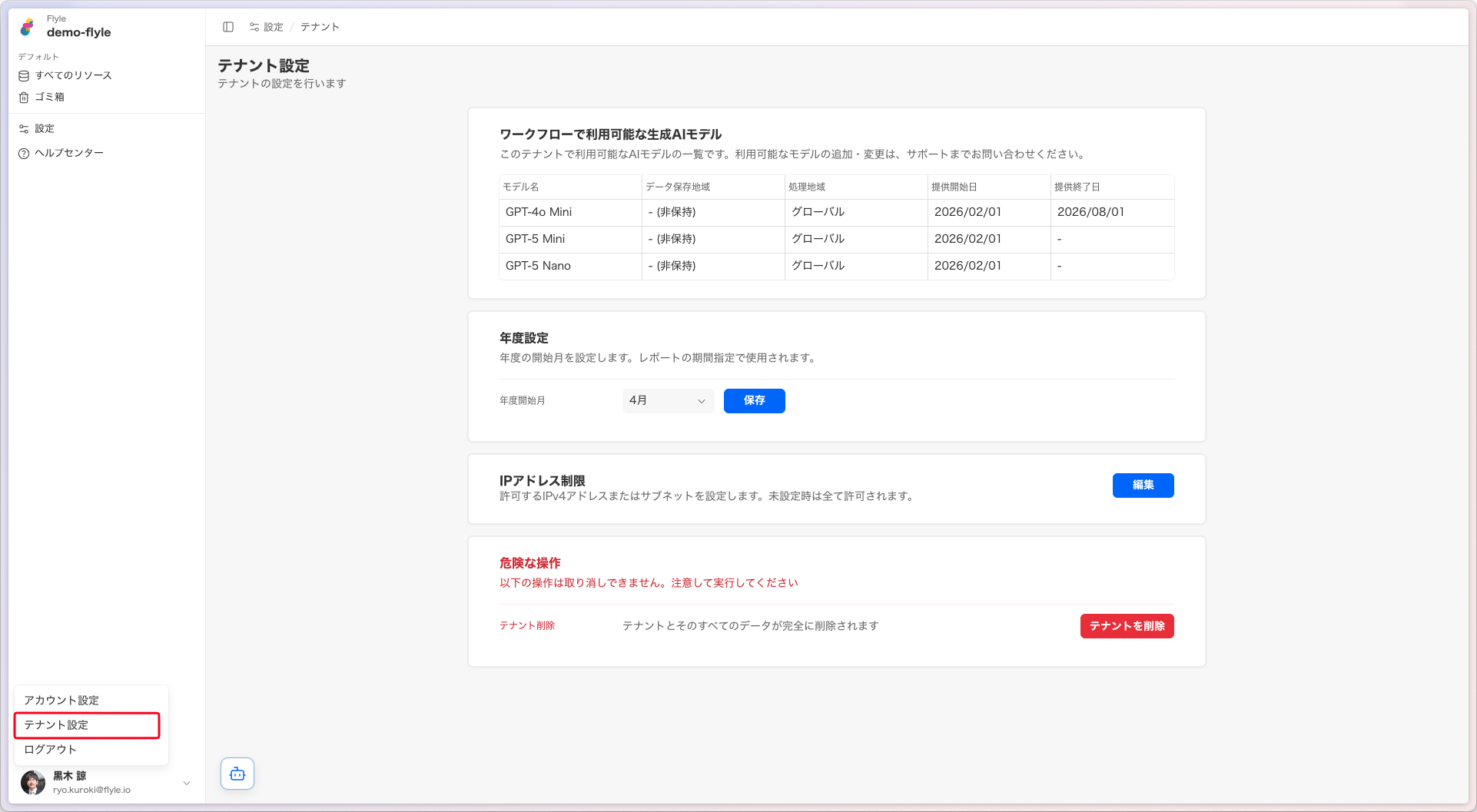 テナント内のテナント設定ページで、以下の設定を変更できます: