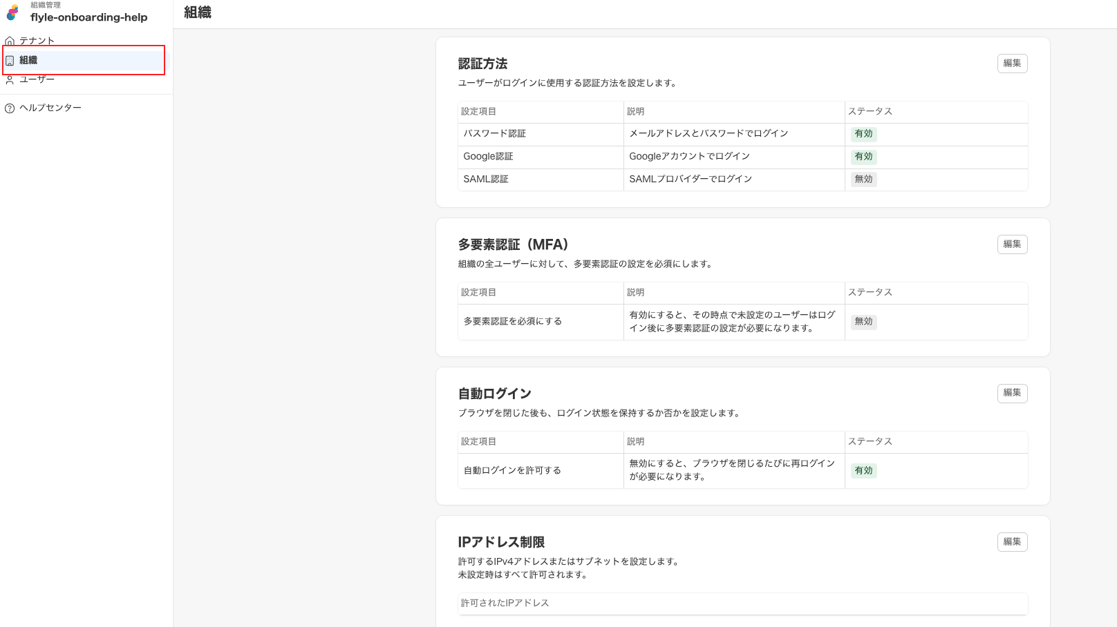 組織の管理者は、組織全体の設定(ログイン方法やセキュリティ設定など)を管理する役割です。