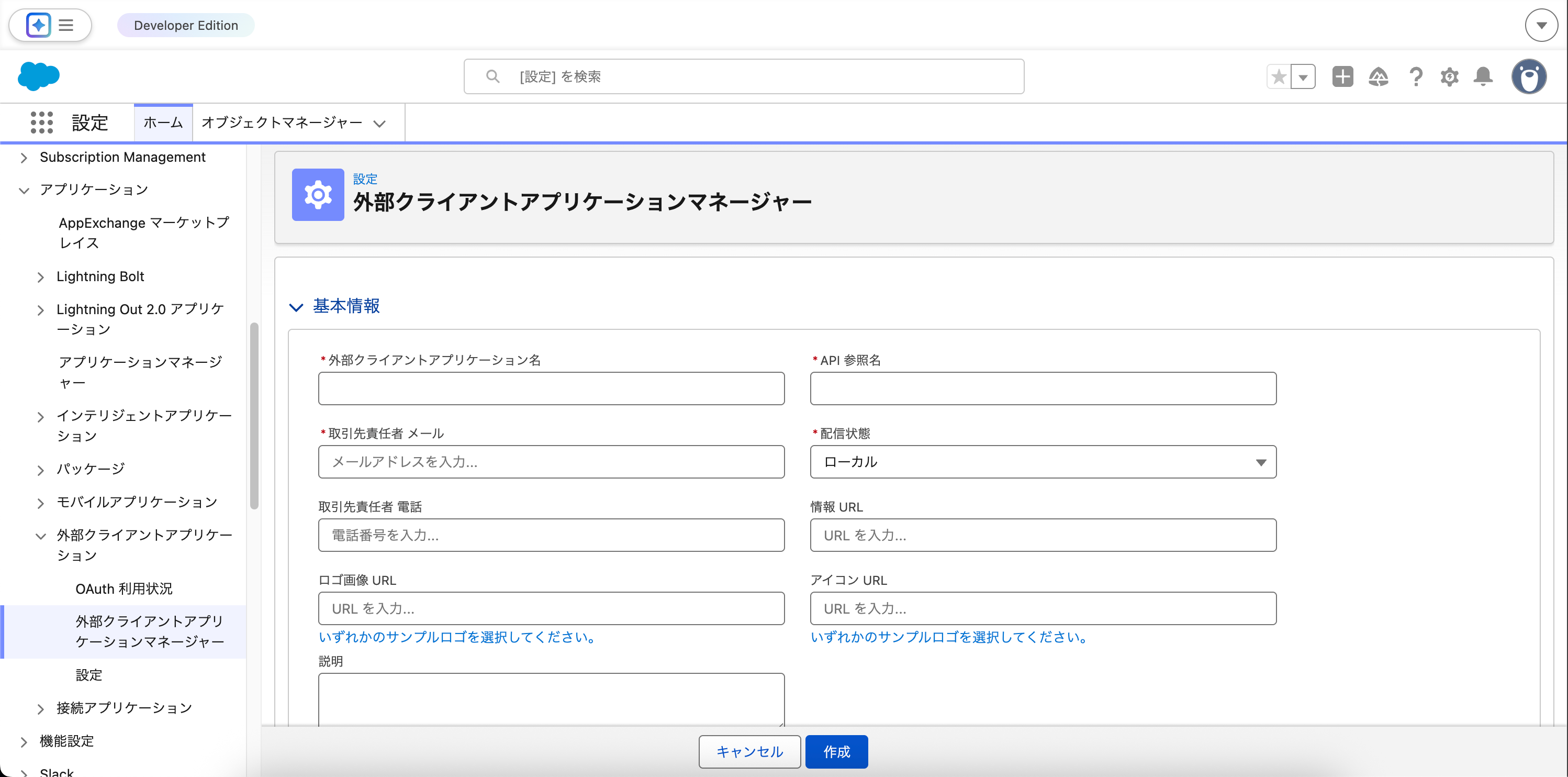 設定 > アプリケーションマネージャ > 新規外部クライアントアプリケーション