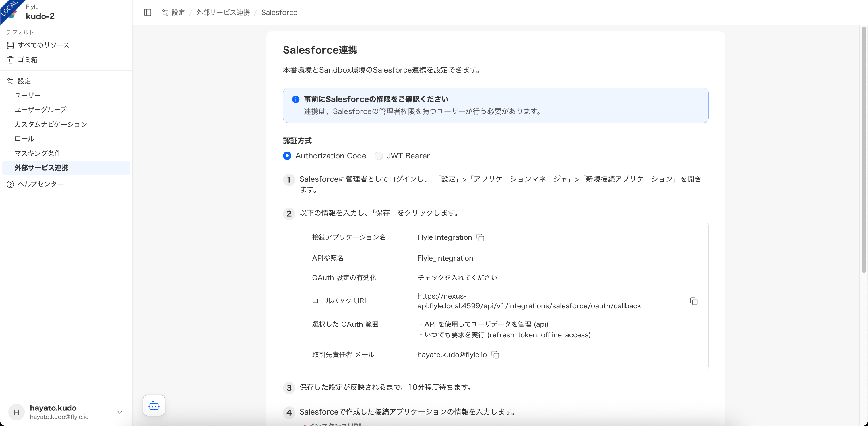 Salesforce側で入力する「コールバックURL」などの値は、Flyle側の設定画面に表示されます。そのため、